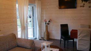 Accommodation consists of two separate bedrooms and one bathroom with a shower for convenience and comfort. The fully equipped kitchen includes a stovetop, refrigerator, electric kettle, kitchenette area, dining table, and access to a shared kitchen space. Guests can relax on the balcony that offers garden views or enjoy the flat-screen TV inside the chalet.