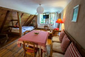 An old-style mountain house was surrounded by a beautiful garden and lush greenery, offering peacefulness near the center. The spacious apartment featured modern amenities such as a dishwasher, microwave, and underfloor heating in the kitchen. The property included charming antique furnishings alongside practical equipment like a toaster and coffee machine. Quiet wooded surroundings with bird songs and nearby streams enhanced the tranquil atmosphere. Several outdoor seating areas overlooked a small pond, providing relaxing spots for guests.